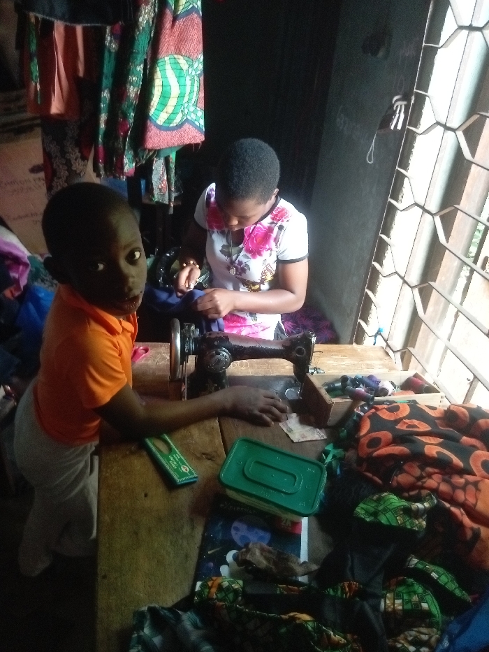 The image depicts an indoor scene within a textile workshop or domestic tailoring area in the city of Unknown, Unknown. An adult female, with short, dark hair and wearing a white top with pink floral patterns, is positioned in the background, seated or crouched behind an older, dark-colored manual sewing machine. She is actively engaged in hand-sewing or adjusting a piece of dark fabric. To the left of the sewing machine, in the foreground, stands a young male child wearing an orange polo shirt and light-colored pants; he is looking directly at the camera. The sewing machine rests on a rustic wooden table, which also holds various items. To the right of the sewing machine, a wooden box contains numerous spools of multi-colored thread. A pile of patterned fabrics, including one with orange circular motifs on a black background, is stacked on the table to the right. Near the child's right hand, several crumpled banknotes are visible alongside a small green rectangular package, possibly containing needles, and a green plastic lidded container. Small pink scissors are partially visible near the child's hip. In the background, on the left, additional fabric or garments are stacked, and several brightly patterned textile pieces hang overhead. Natural light illuminates the scene from a window on the right, fitted with a metal security grill featuring a diamond-shaped pattern.