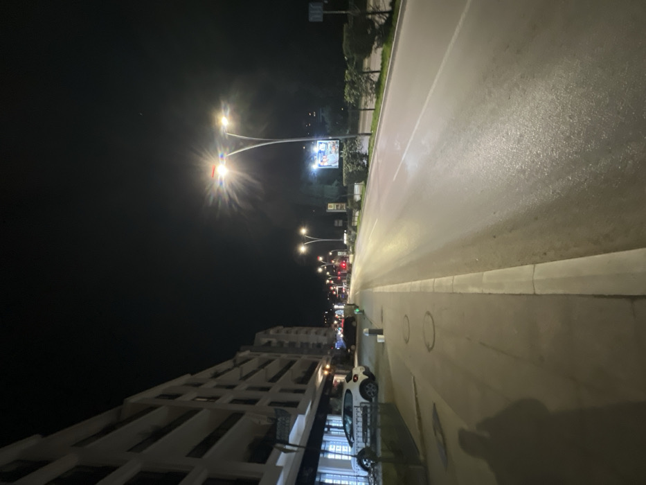 The image depicts a nighttime street scene in Budva, Montenegro, viewed from a pedestrian sidewalk. The foreground on the left features the distinct shadow of a person, presumably the photographer, cast upon a paved sidewalk containing two circular manhole covers and a single white bollard. Adjacent to the sidewalk is a multi-story building with a light-colored facade, featuring multiple balconies on its upper floors. The ground floor of this building appears to house commercial establishments with large, illuminated display windows and dark awnings. A white five-door hatchback is parked parallel to the curb in front of one of these establishments, with a darker vehicle partially visible behind it. To the right of the sidewalk lies an asphalt road, illuminated by streetlights, creating reflective patches on its surface. The road appears to be a two-lane thoroughfare, with a light volume of traffic visible in the distance as red and white vehicle lights. On the right side of the road, a landscaped median or verge features low green shrubs and trees. Several streetlights, characterized by tall, Y-shaped poles supporting multiple light fixtures, illuminate the scene, with the nearest streetlight exhibiting prominent lens flares. Further down the road on the right, a large, illuminated billboard is visible amidst more vegetation and distant urban structures. The sky overhead is dark and clear. The overall scene conveys a calm, urban environment at night with artificial illumination.