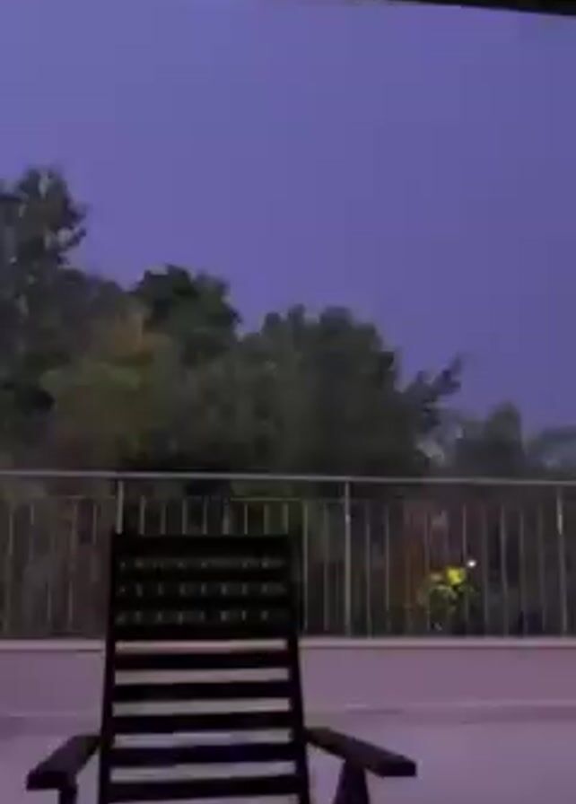 dark and rainy night scene from a balcony or patio. A wooden rocking chair is in the foreground, facing the railing. Beyond the railing, dark trees and foliage are visible against the night sky, which is punctuated by occasional flashes of lightning. Rain is falling, and the sound of the rain can be heard. A single light source is visible among the trees. The camera is static.