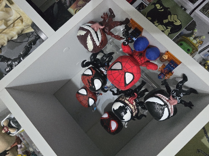 The image depicts an interior display of collectible figures arranged within a white, modular shelving unit. The primary visible compartment contains nine figures: five stylized vinyl figures, characteristic of Funko Pop! designs, featuring three Spider-Man variations (red with black webbing and white eyes, black with white spider emblem and white eyes, red with black spider emblem and white eyes) and two black Venom figures characterized by prominent white eyes, bared teeth, and extended tongues. A red plush Spider-Man figure with blue hands and feet is also present. Additionally, a reddish-brown textured figure, resembling Carnage with white eyes and an extended tongue, is displayed. Two smaller minifigures, one in a blue and orange suit and another as a head and torso on a light brown base, are positioned near the plush Spider-Man. An upper-right compartment exhibits a metallic silver Iron Man action figure in a dynamic pose, alongside a partially visible light-colored statue depicting a figure with draped fabric. Below these, a graphic print featuring a dark, stylized character on a green background is visible. Further peripheral views show partial glimpses of other figures and collectibles on adjacent shelves. The environment is consistent with a personal collection display or a retail setting. No visual information within the image definitively identifies a specific location within the city of Sofia, Bulgaria.