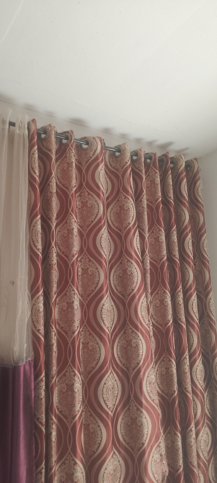 The image displays an interior scene featuring a layered window treatment against a plain white ceiling. The upper portion of the frame shows a white ceiling or upper wall with a textured, slightly uneven finish. A dark-colored curtain rod extends horizontally across the upper middle section of the image. Suspended from this rod are a series of heavy, opaque curtains characterized by a repeating pattern. The dominant colors are a deep reddish-brown or maroon and a lighter cream or beige. The pattern consists of large, elongated, undulating ovals or tear-drop shapes in the lighter cream/beige color, framed by wavy vertical stripes in the reddish-brown. Within these lighter ovals, intricate, symmetrical floral or damask-style motifs are visible in a slightly darker shade of red or maroon. These curtains are hung using dark metal grommets (eyelets) threaded onto the rod, creating uniform vertical pleats. To the far left of the main patterned curtains, a section of a translucent, off-white or sheer cream curtain is visible, hanging as an inner layer. Below this sheer curtain and partially obscured by the patterned curtain on the left, a portion of a solid, deep purple or magenta curtain with a smooth, possibly satin-like texture is present, indicating another curtain layer. No individuals or actions are depicted in the scene. The lighting appears even, suggesting an indoor environment.