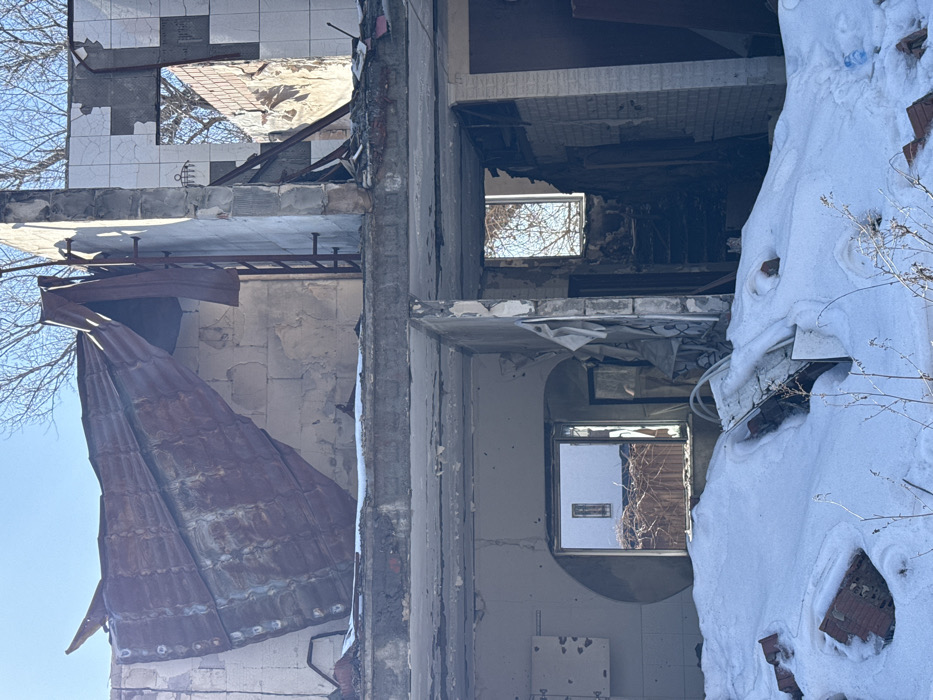This image depicts a heavily damaged, two-story building in Irpin, Ukraine, under winter conditions