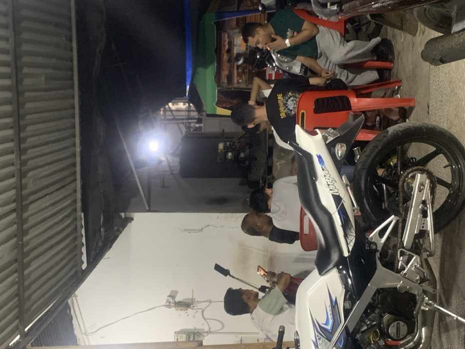 The image depicts a nighttime scene at a casual gathering spot in Lhokseumawe, Indonesia, characterized by a corrugated metal roof structure. In the foreground, a white and blue Kawasaki Ninja motorcycle with black accents is parked on a kickstand, facing right. To the left, a white wall with electrical meters and wiring is visible. Multiple adult males are present, seated on red plastic chairs around tables. On the far left, a male in a white and green short-sleeved shirt is seated, holding a smartphone attached to a selfie stick and looking at the device. Next to him, a bald male in a dark shirt is seated, looking towards the right. Further right, a male in a light grey hooded sweatshirt is seated, facing away from the camera. In the center-right, another male, wearing a black t-shirt with "SQUADNATURR" visible on the back, is seated with his right arm raised to his head, also facing away. On the far right, a male in a dark green t-shirt and light grey sweatpants is seated, holding a lit cigarette to his mouth and looking left. In the background, a bright light source illuminates the area. A street vendor cart with a green and blue tarp roof is partially visible on the far right. Other motorcycles are also partially visible in the background. The overall scene suggests a social gathering at a roadside establishment.