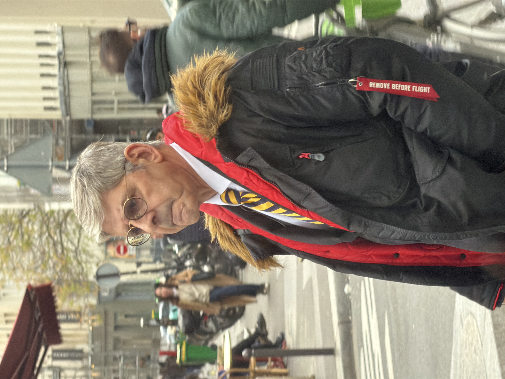 The image depicts a man in Paris, France. He is wearing a black bomber jacket with a fur-lined hood and a red "REMOVE BEFORE FLIGHT" tag attached to the sleeve. Underneath the jacket, he has on a white shirt and a tie with diagonal yellow and black stripes. He is wearing round, wire-rimmed glasses. The background shows a busy Parisian street with buildings, pedestrians, parked motorcycles, and street furniture. There is also a bike rental station visible.