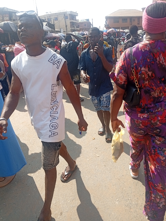 The image depicts a bustling outdoor street scene in Fegge, Nigeria, characterized by bright daylight and numerous pedestrians. In the immediate foreground, a young adult male with dark skin is walking towards the viewer, angled slightly left. He wears a white sleeveless top with "BALENCIAGA" printed vertically on the left side, dark distressed shorts, and flip-flops. Black sunglasses are perched on his head, and he holds a small blue object in his right hand. To his right, slightly further back, another young adult male with dark skin is walking, holding a black smartphone to his right ear. He wears a dark blue unbuttoned short-sleeved shirt and patterned shorts, with dark slides. On the far right foreground, the back of a person, likely female, is visible, wearing a vibrant multi-colored top and matching wide-leg trousers, a black shoulder bag with a gold chain strap, and a reddish-pink headband. This individual carries a light yellow plastic bag in their right hand and wears light-colored shoes. The ground is paved, and strong shadows are cast by the pedestrians. The background reveals a dense crowd of people, various market stalls with merchandise visible, and multi-story buildings under a clear sky, indicating a busy commercial district.