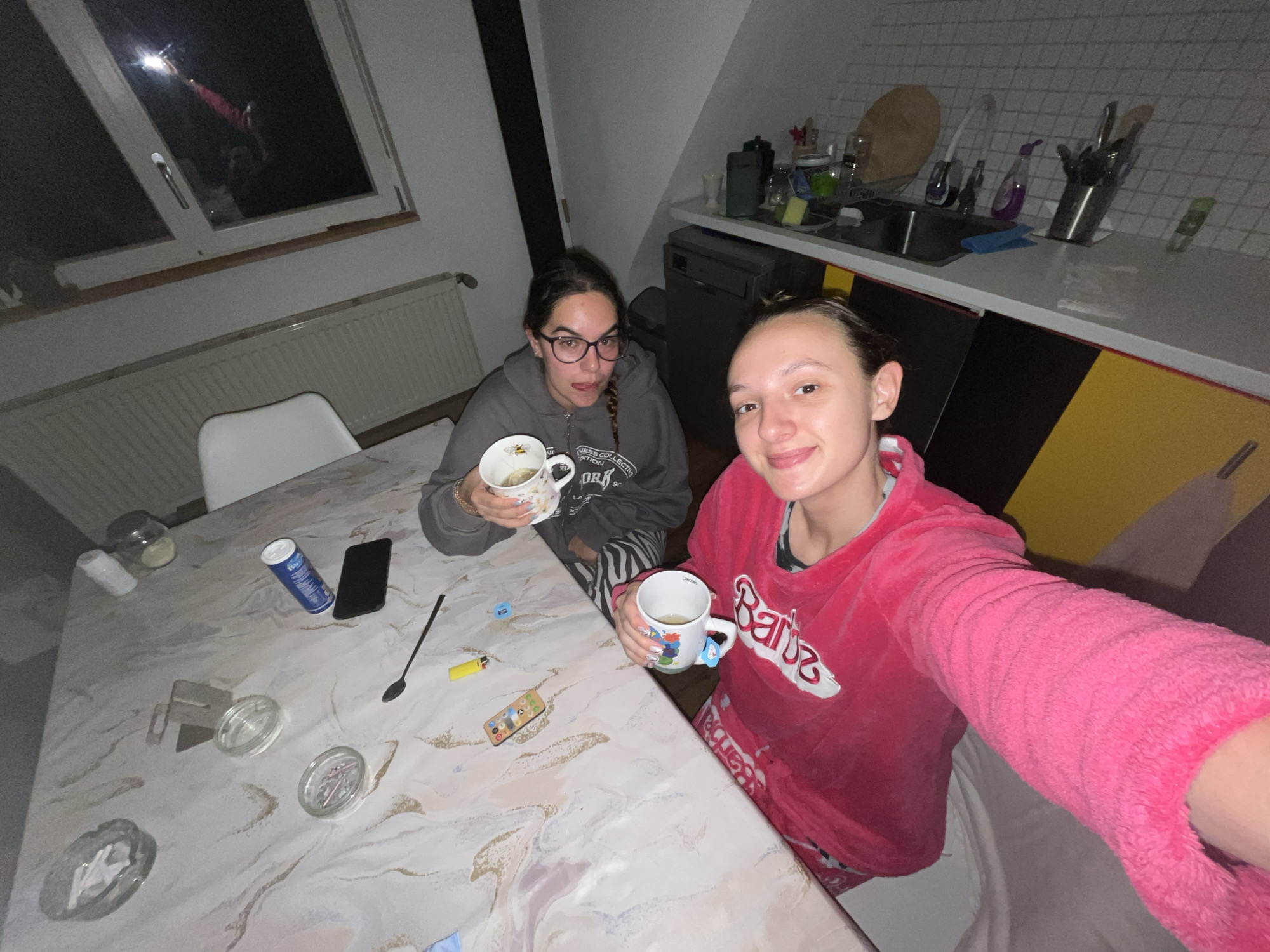 Two young women are seated at a table in what appears to be an indoor kitchen environment. The table is covered with a marble-patterned surface and has various items scattered on it, including ashtrays, a lighter, a spoon, a mobile phone, a blue container, and several glasses and jars. Each woman is holding a mug, suggesting they might be having a hot beverage. The woman on the left is wearing glasses and a gray hooded sweatshirt. The woman on the right is holding the camera and is wearing a pink, fluffy sweater. In the background, there is a window, a radiator, kitchen counters, cabinets, a sink, and various kitchen utensils and appliances. Given the angled ceiling and window placement, the location might be in an attic apartment. While no specific city location is discernible, the context is given to be Saarbrücken, Germany.