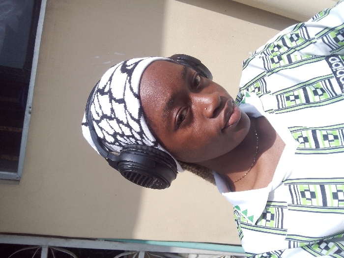 A young individual with dark skin is depicted in a close-up outdoor photograph, captured from the chest up