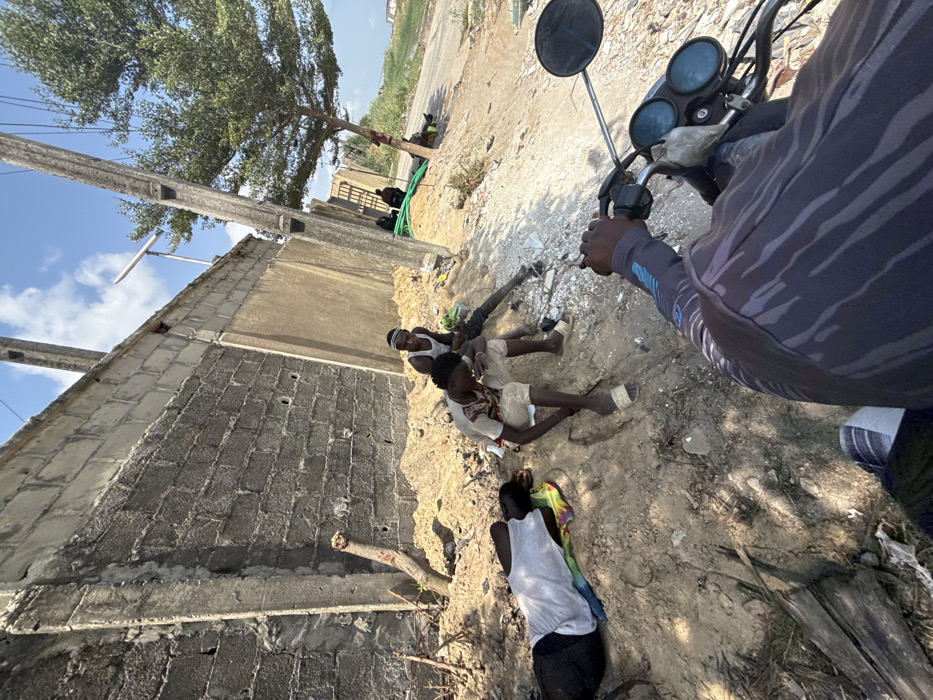 A daytime scene in Ojomu, Nigeria, captured from the perspective of an individual seated on a motorcycle. In the immediate foreground, a dark-skinned arm, clad in a grey long-sleeved shirt with black and blue patterns, grips the right handlebar of a motorcycle; a portion of the dashboard with two circular gauges and a rearview mirror is visible. In the midground, on a dusty, sandy area adjacent to a rough concrete block wall, three individuals are positioned. To the left, one individual lies prone on their left side upon a multicolored fabric (red, blue, yellow, green), wearing a light grey t-shirt and dark trousers, facing away from the camera. To their right, two young males are seated directly on the ground. The closer male wears a light-colored, short-sleeved patterned shirt, light shorts, and white open-toed sandals, appearing to interact with an object in his hands. The second male, situated behind him, wears a white sleeveless top, dark trousers, and a white head covering, also looking down at an object in his hands. Miscellaneous debris is scattered on the ground near these seated individuals. The concrete wall, composed of grey blocks and smoother sections, forms a prominent background element. Beyond the wall and individuals, a paved road is visible, running parallel to the wall. Along the roadside, a leafy green tree and several concrete utility poles are present. Further down the road, two additional figures are discernible, seated or resting near the roadside. The sky above is blue with scattered white cumulus clouds, and the scene is illuminated by direct sunlight.