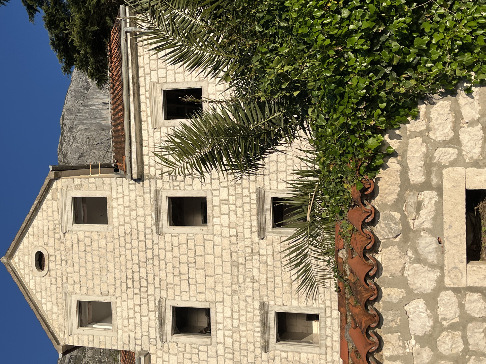exterior of a building in Dobrota, Montenegro. The building is constructed of light-colored stone blocks with six square window openings and one circular window near the top. The windows are empty, without panes or curtains. Parts of the building are covered in green ivy and palm leaves. A section of the roof is visible with orange terracotta tiles. In the background, part of a rock formation topped with a tree is visible against a blue sky. The scene appears to be well-lit by daylight.