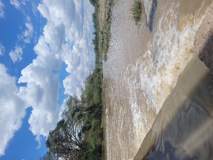 The location is unknown within an unspecified city and country. The image captures a daytime scene of a wide, turbid river flowing over a man-made structure, possibly a weir or part of a culvert. In the foreground, a dark, angled concrete or stone structure creates a visible drop, over which muddy brown water churns into white rapids and foam, flowing towards the right. The river extends into the midground, appearing calmer further downstream, with small patches of green vegetation and exposed earth visible along the banks. The left riverbank is densely covered with numerous green trees and bushes, extending towards the horizon. The right bank features sparser vegetation and more exposed soil. The upper portion of the frame is dominated by a clear blue sky interspersed with large, white cumulus clouds. No people or animals are visible. The lighting is bright, indicating a clear or partly cloudy day.
