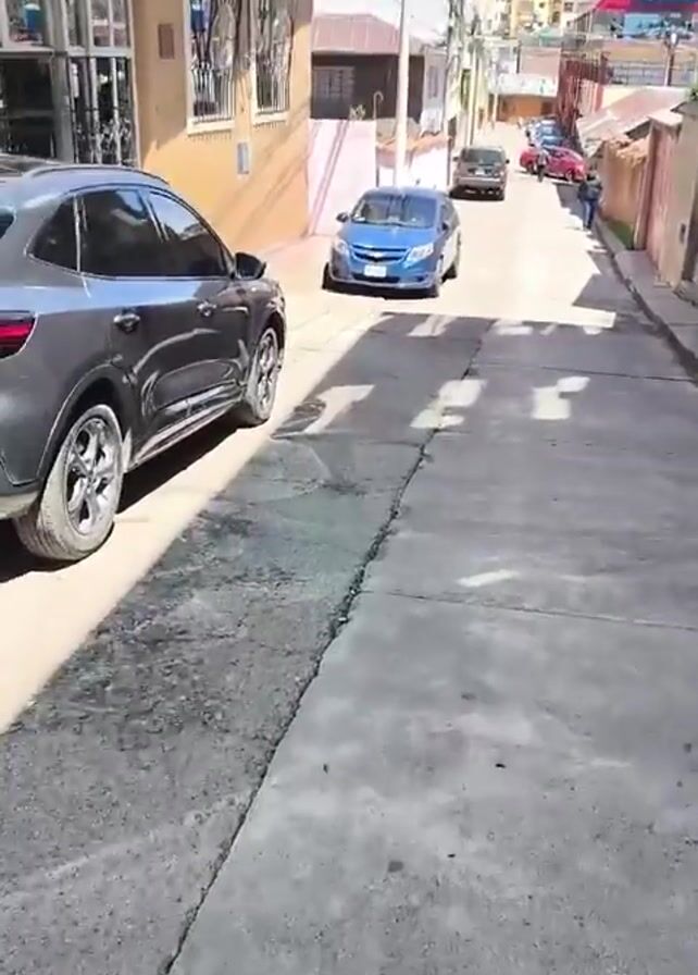 street in a city. The street slopes downhill and has sidewalks on either side. There are cars parked along the sides of the street. A gray SUV is parked on the left. A blue car is parked a little further down the street. There are several other cars parked further down the street. A man is walking down the sidewalk on the right side of the street. Another man is standing on the sidewalk on the right side of the street. The buildings on either side of the street are made of concrete and painted different colors. There are power lines overhead. In the background, there is a hill with buildings on it. The sky is blue and the sun is shining.