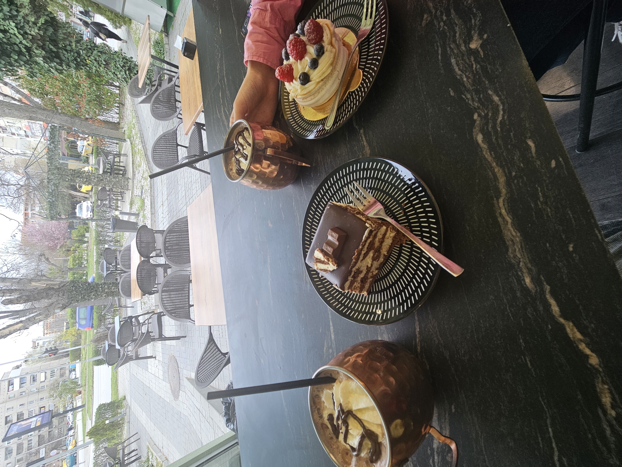 A high-angle shot shows two desserts and two drinks on a dark, patterned tabletop. A cake adorned with berries sits on a black plate with white markings, with a hand in a pink sleeve nearby. Another plate with a slice of chocolate cake and a fork is visible. Two copper-colored mugs filled with beverages and straws are also present. A street scene is visible through a window, featuring outdoor seating, trees, and buildings, possibly in Plovdiv, Bulgaria. The scene appears to be an outdoor cafe setting.