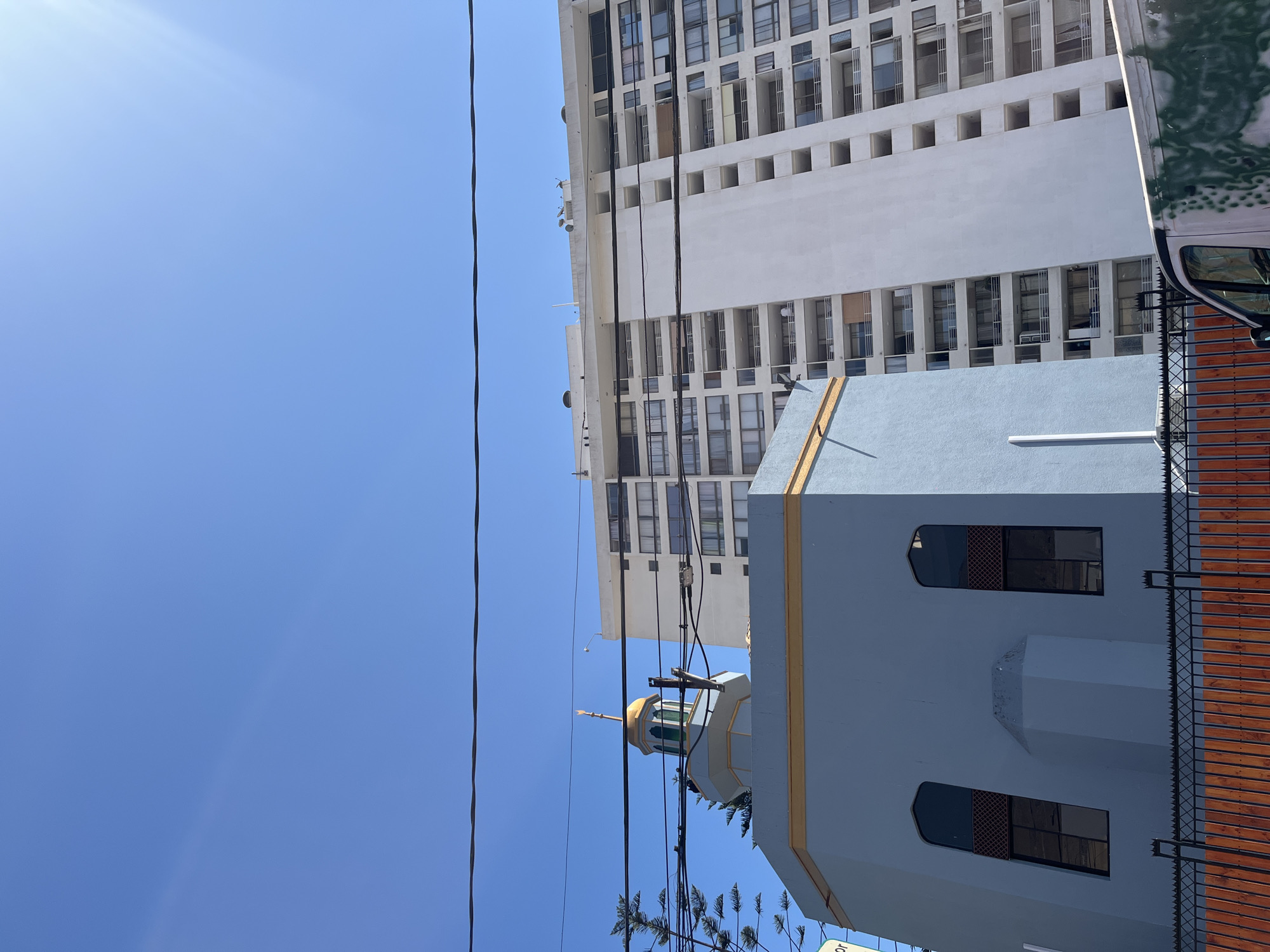 low-angle shot of a building complex in what appears to be an urban setting. A tall, white building with numerous windows dominates the scene. A smaller, blue building with distinctive arched windows and a dome-like structure with a gold-colored spire is positioned closer to the viewer. A brown wooden fence is also visible. Power lines run across the sky. The sky is clear and blue. The location is Unknown, Unknown.