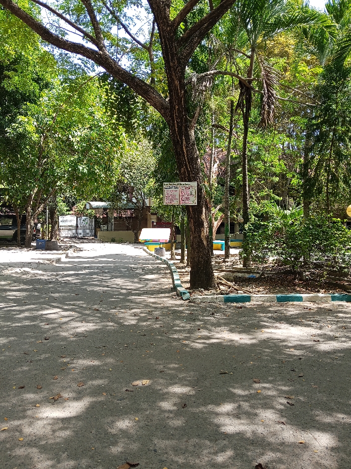 A shaded asphalt road leads into a park-like area. Lush green trees surround the scene, casting dappled shadows on the road. A tree in the foreground displays a posted sign. Beyond, there are benches and small structures. The area looks well-maintained with painted curbs. The lighting is bright, suggesting a sunny day.