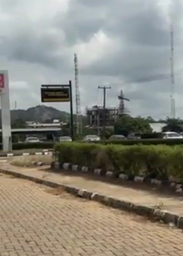 paved area in front of buildings with green trees and bushes. There are several tall communication towers visible in the distance. The camera pans to the right, showing a GTCO sign and a sign indicating "Royal Airport Services." The camera continues to pan, revealing a group of people in the distance walking down the paved area. A large UBA ATM sign is visible, and behind it, a white and gray building is partially visible. In the background, a lush green hill can be seen. The sky is overcast with gray clouds.