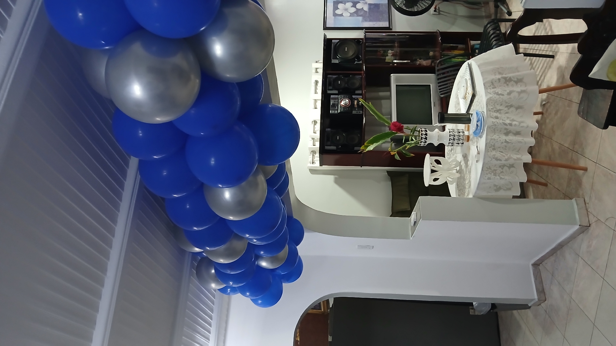 The scene depicts an indoor residential setting in Tacarigua, Venezuela, prepared for an event. An arc of alternating royal blue and silver balloons is suspended from a white, ribbed false ceiling, extending through the center of the visible space. The floor is covered with light-toned ceramic tiles. White walls and arched doorways define the interior architecture. In the midground, to the right, a round table draped with a white lace tablecloth features several items: a white decorative object resembling a butterfly, a white vase with black geometric patterns containing red flowers and green foliage, a dark cylindrical thermos, a white plate, a blue surgical mask, and several small white objects. Partial views of dark-colored chairs surround this table. In the background, a dark wooden entertainment unit houses a stereo system with multiple speakers, positioned above a silver-toned CRT television. To the right of this unit, a framed picture displaying white flowers against a blue background hangs on the wall. A dark green sofa or cushion is partially visible through a doorway on the right. On the far right, a black stand fan is partially visible. Through an archway on the left, a dark gray trash bin is visible. No individuals are present in the scene, and no actions or interactions are depicted.