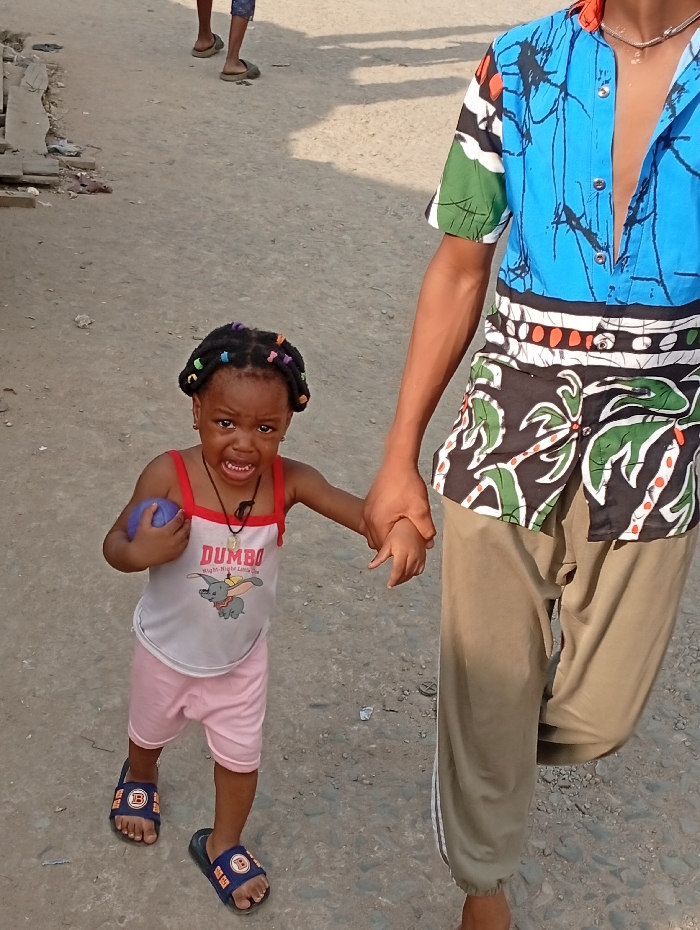 A young child with braided hair walks hand-in-hand with an adult. The child wears a "Dumbo" tank top, pink shorts, and sandals. The adult wears a colorful, patterned shirt and khaki pants. The child holds a small blue object in the free hand, and the background appears to be a street. A person's legs are visible in the background as well.