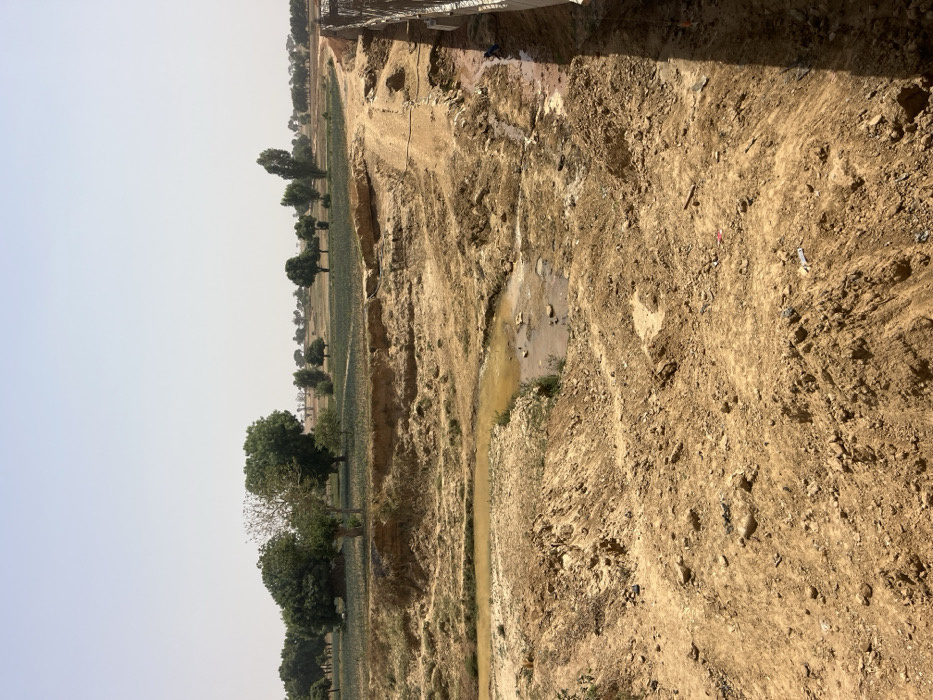 This image depicts an expansive outdoor scene in Wuciciri, Nigeria, observed under a clear, bright, and possibly hazy daylight sky. The foreground and midground are dominated by disturbed, dry, light brown earth, characterized by extensive erosion, dirt mounds, and visible tire tracks or paths. In the mid-ground, an irregular body of turbid, brownish-yellow water is present, suggesting a shallow stream or large puddle. To its immediate right, a smaller, darker pool of water collects near a man-made structure. Beyond the immediate disturbed terrain, a flat expanse of cultivated green crops, appearing to be row-planted, is visible. This cultivated area is slightly elevated from the foreground by an eroded dirt embankment. Further into the background, numerous scattered trees with green foliage form a sparse tree line against the horizon. On the far right side of the image, a partially constructed grey concrete structure is present, possibly a bridge abutment or culvert. It shows finished concrete walls and exposed elements that may be reinforcement bars or formwork. A dark blue object, resembling a tarp or fabric, is visible near the base of this structure. No individuals are present in the scene. Scattered small pieces of light-colored debris are visible on the disturbed ground in the foreground.