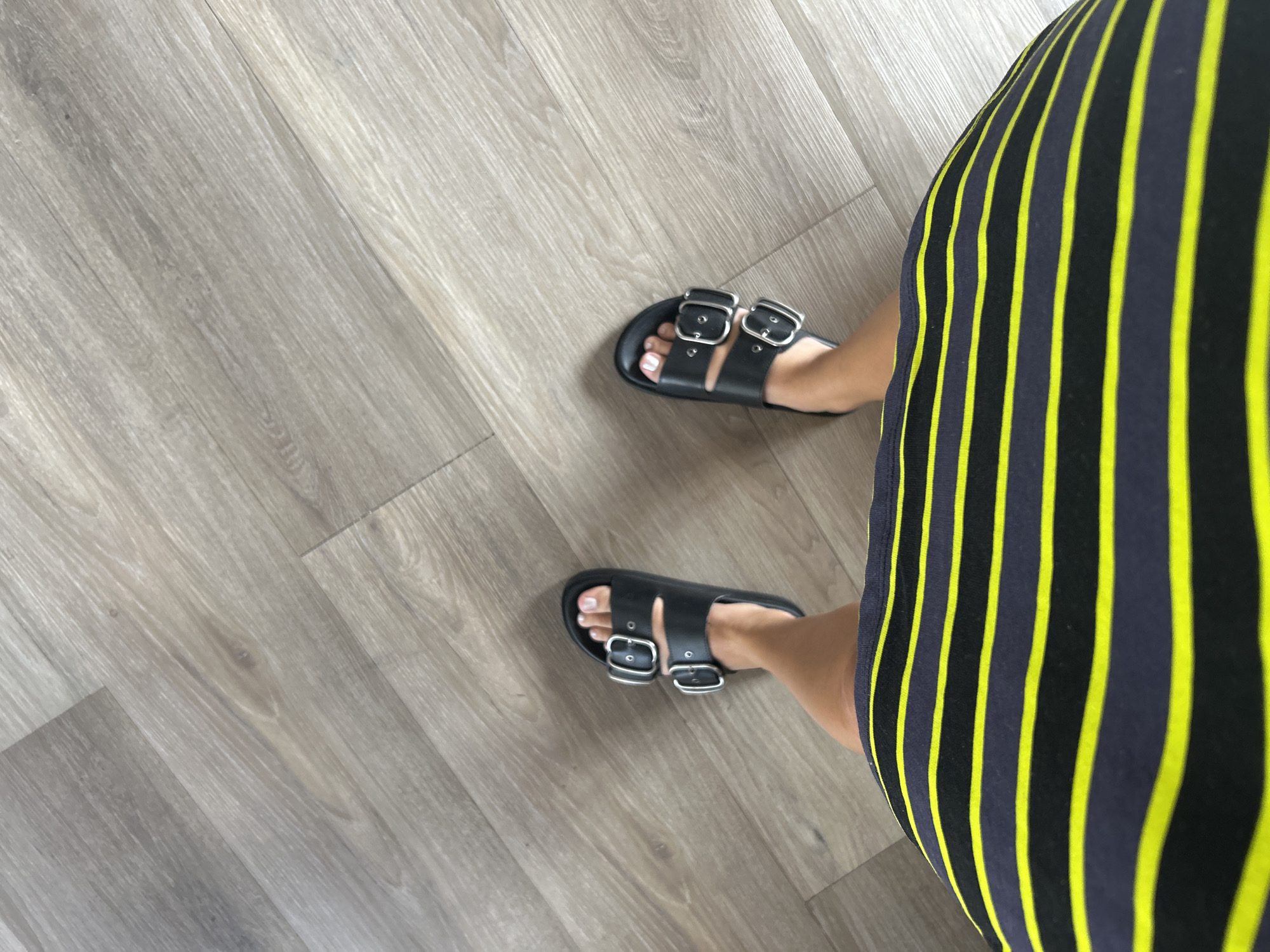 A high-angle shot shows a person standing on a gray wood-look floor. The person is wearing a black and yellow striped garment, with only a portion of it visible on the right side of the frame. On their feet, they are wearing black sandals with two silver buckles each. The floor is light gray with a wood grain pattern, oriented diagonally from the top left to the bottom right of the image. The backdrop location in the city of Maracay, Venezuela, is not evident from the visual elements alone.