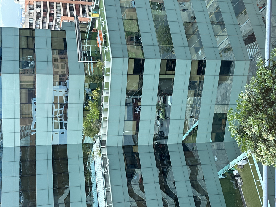 - "This image displays a multi-story building with a light greenish-blue glass and panel facade, located in the city of Las Condes, Chile" by FM-wrSCM2, licensed under CC BY 4.0