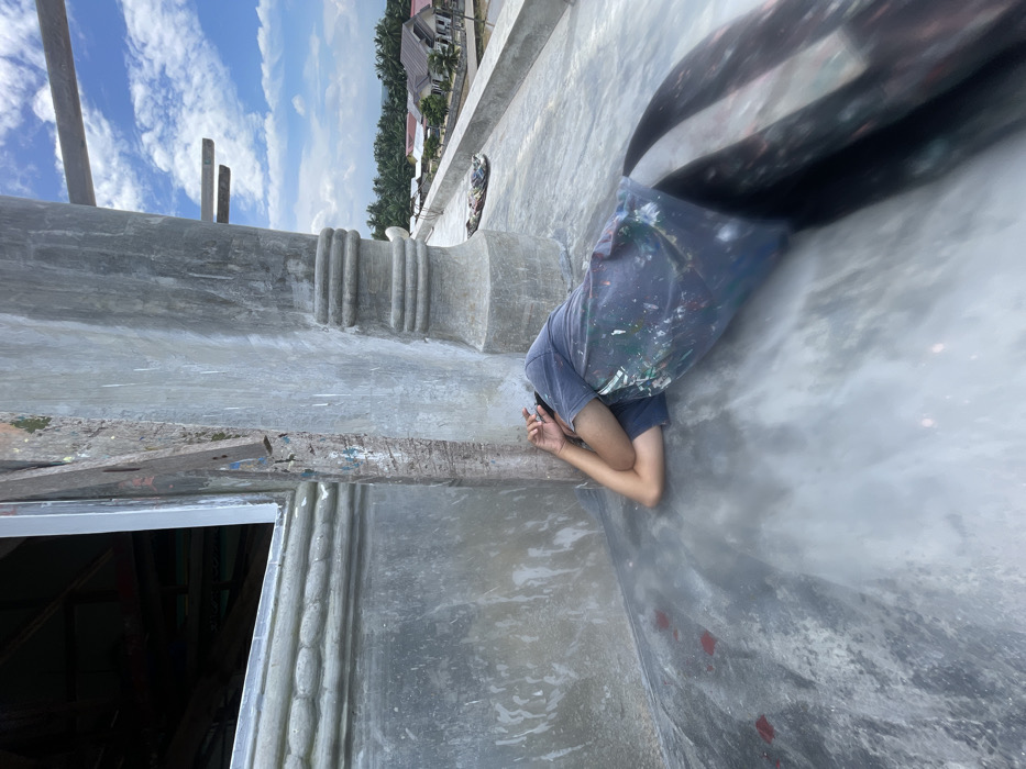 An elevated image captures a single individual lying prone on a grey concrete rooftop surface in Mns Asan, Indonesia. The person, oriented with their head toward the upper left, wears a dark t-shirt heavily stained with various paint colors and dark pants that exhibit a pronounced streaked or blurred artifact, particularly on the lower half. Their arms are bent, with hands covering their face. To the immediate left, an unpainted concrete wall with a horizontal molded design features an open window frame, revealing a dark interior. A rough wooden plank leans against this wall. Adjacent to the individual on the right, a vertical concrete column with multiple circumferential moldings rises. Exposed wooden construction beams are visible extending skyward from the right side of the structure. In the background, under a clear blue sky with scattered white clouds, a residential area with red-roofed houses and extensive green palm tree foliage is visible, extending towards a faint distant horizon suggesting a body of water.