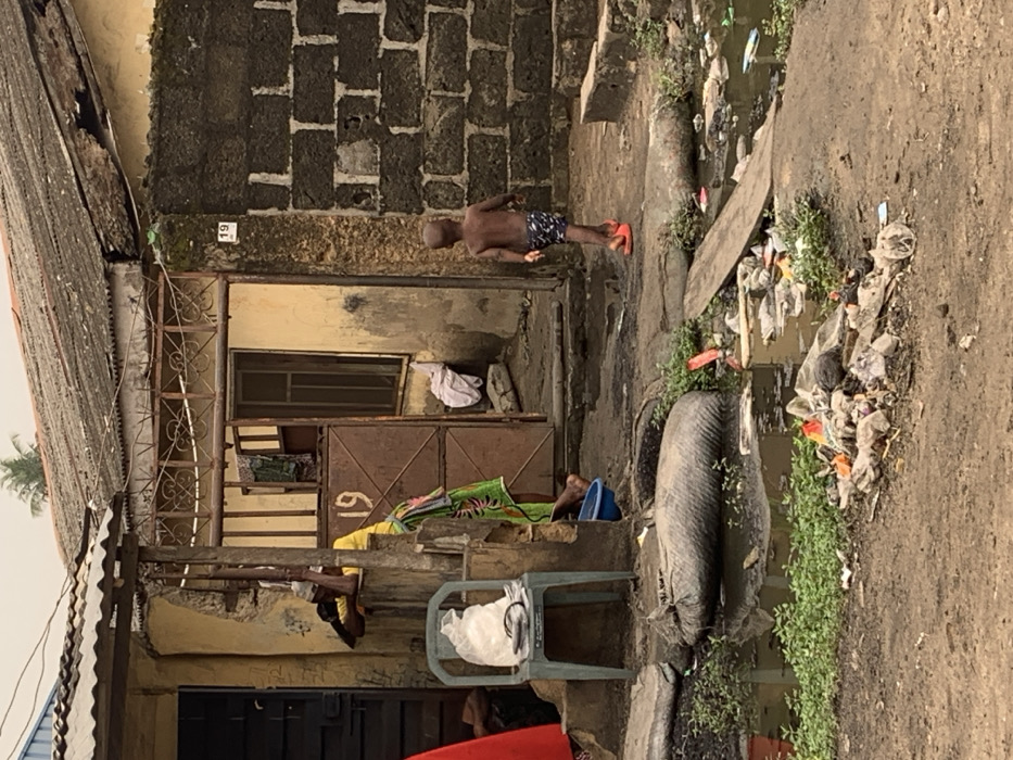 The image depicts a crowded, unpaved urban environment in Lagos, Nigeria, characterized by informal housing and poor sanitation under an overcast sky