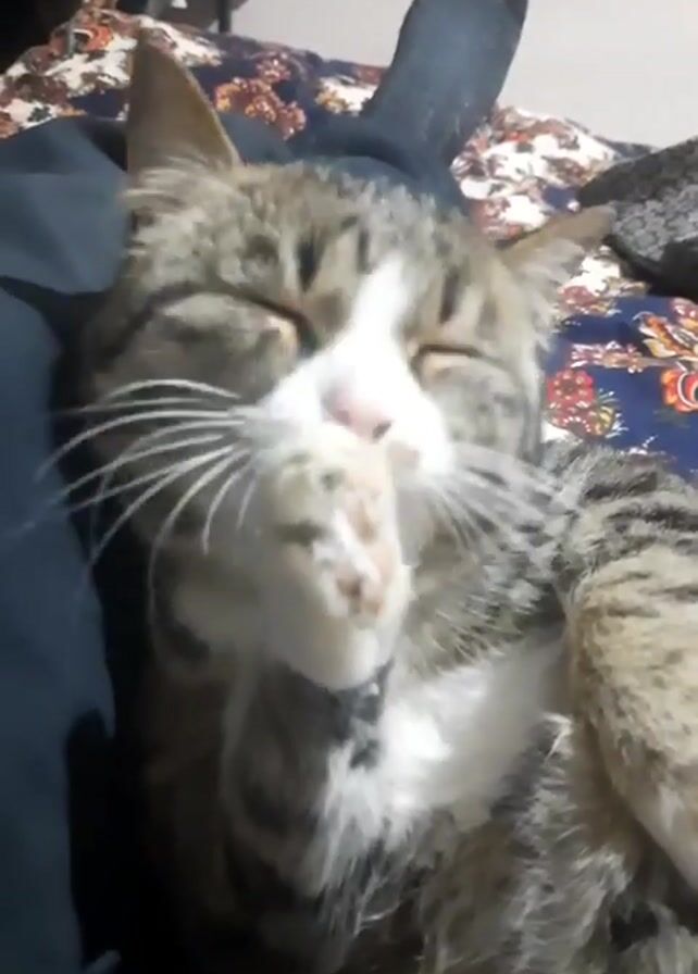 - "A tabby cat is lying on someone's lap on a bed with a patterned comforter" by FM-0zE9q2, licensed under CC BY 4.0