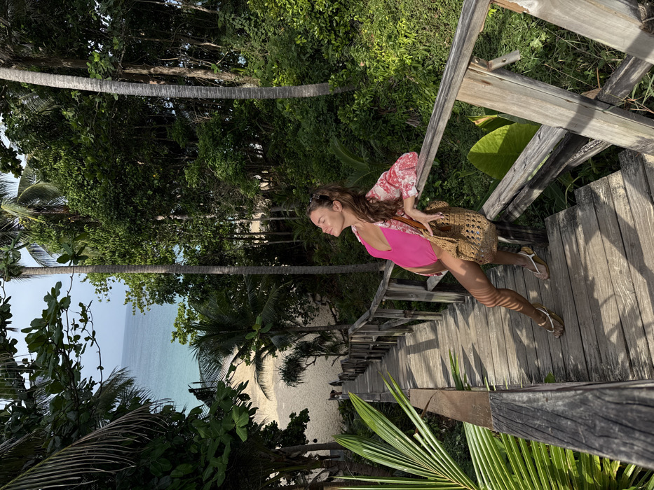 A woman in a vibrant pink swimsuit and patterned cover-up descends wooden stairs towards a beach. She carries a woven bag. Lush green foliage surrounds the staircase, framing the view of the sandy beach and turquoise ocean below. Tall palm trees line the path. Sunlight filters through the vegetation.