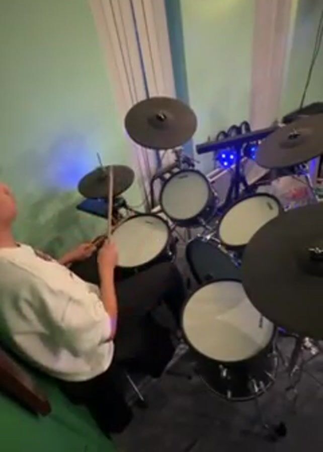A young man plays an electronic drum set