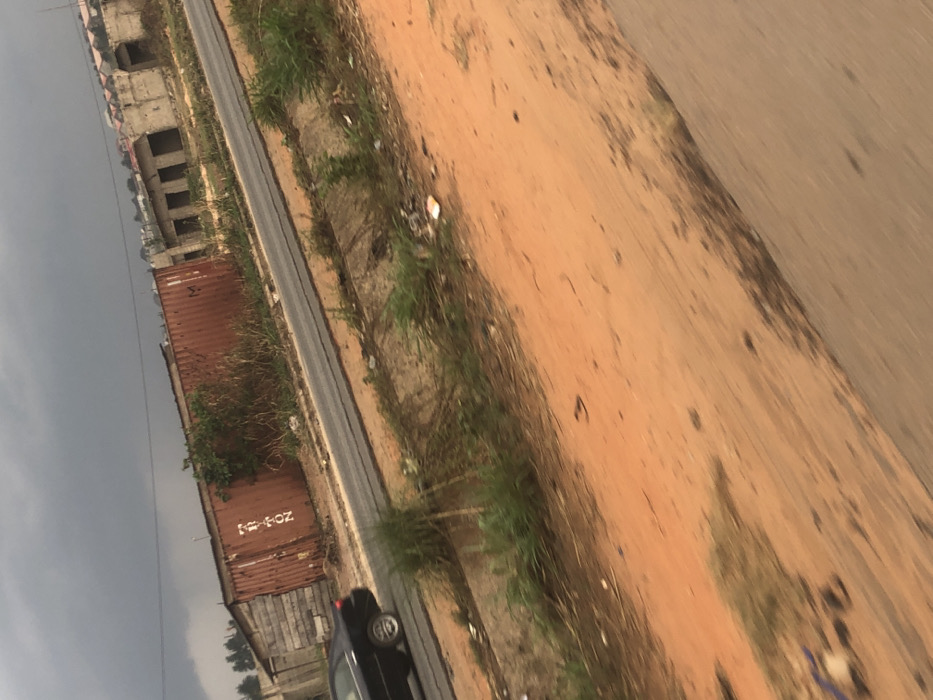A road runs diagonally across the frame, bordered by a dusty, red-earth shoulder. Green vegetation grows along the road's edge. A shipping container and a partially visible black car are on the left. In the background, a grey sky looms over an unfinished building, presenting an overall slightly tilted perspective. Some scattered trash is also present near the vegetation.