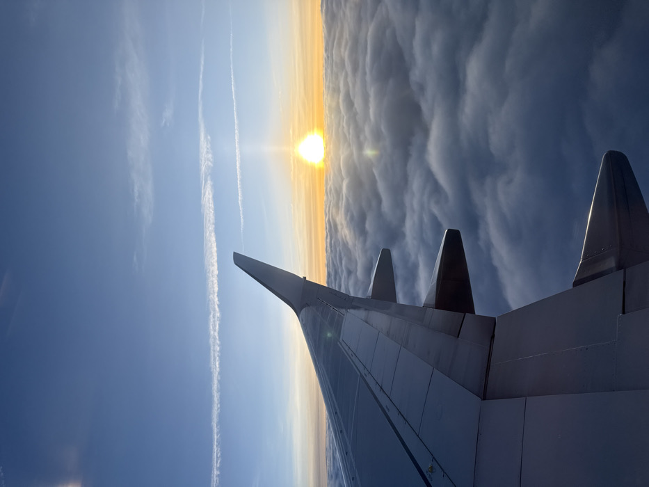 The image displays an aerial view from an aircraft in flight, captured from a window. The left side of the frame is dominated by the grey metallic wing of a commercial airplane, extending from the lower left towards the upper center, with a distinct winglet visible. Below the wing and extending across the majority of the lower and right portions of the frame is a dense, uniform layer of white and grey stratocumulus clouds. The sun, a bright yellow-orange orb with visible lens flare, is positioned low on the horizon line in the upper right quadrant, partially obscured by the cloud layer and emitting rays of light upwards. The sky above the clouds transitions from a soft orange-blue near the horizon to a clear, deeper blue towards the top of the frame, with several faint white contrails visible. No people or ground features are visible, and the scene is set high above any discernible city location, thus preventing identification of Niederanven, Luxembourg.