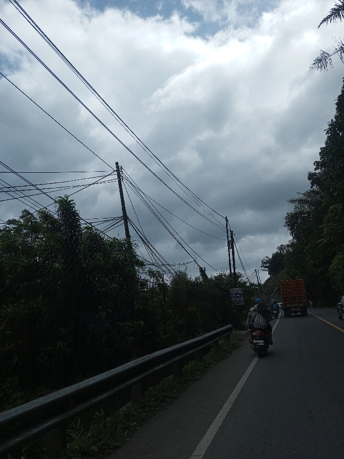 The image depicts a roadside scene in Gubbisamamidi, India, observed under an overcast sky with dense grey clouds. In the foreground, a metallic guardrail extends along the left edge of an asphalt road, which features a solid white line marking the shoulder. The road curves slightly to the right in the mid-distance. A dark-colored scooter, carrying two individuals (one in a blue helmet), travels away from the viewer on the left side of the road. Further ahead, a large orange truck with an open bed is visible in the right lane, followed by other vehicles in the distance. The left side of the road is characterized by dense green vegetation and several wooden utility poles supporting a complex, tangled network of overhead electrical or communication wires. Lush, dark green trees line the right side of the road, extending upwards to form a dense hillside backdrop.