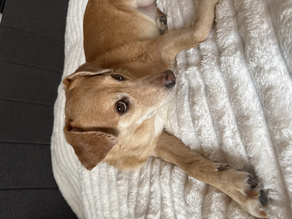 An indoor scene depicts a tan-colored, short-haired dog resting on a white, textured, fluffy blanket
