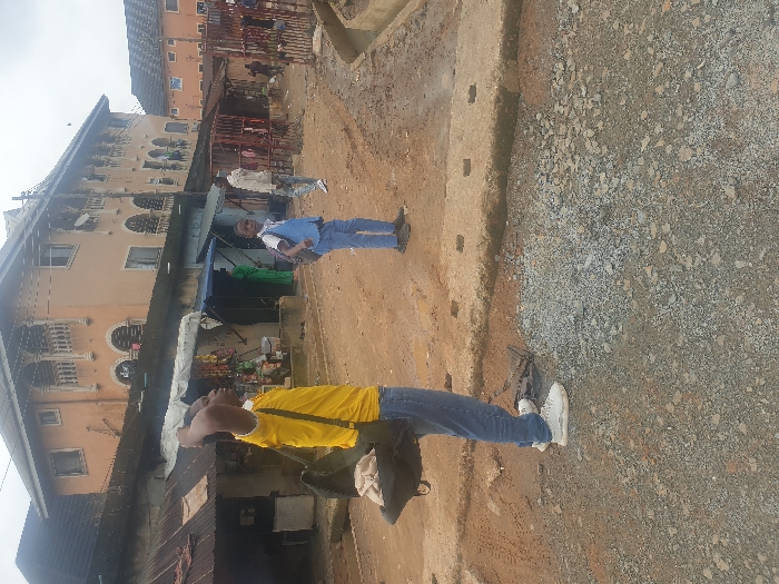 The image portrays an unpaved street scene in Aba, Nigeria, under an overcast sky