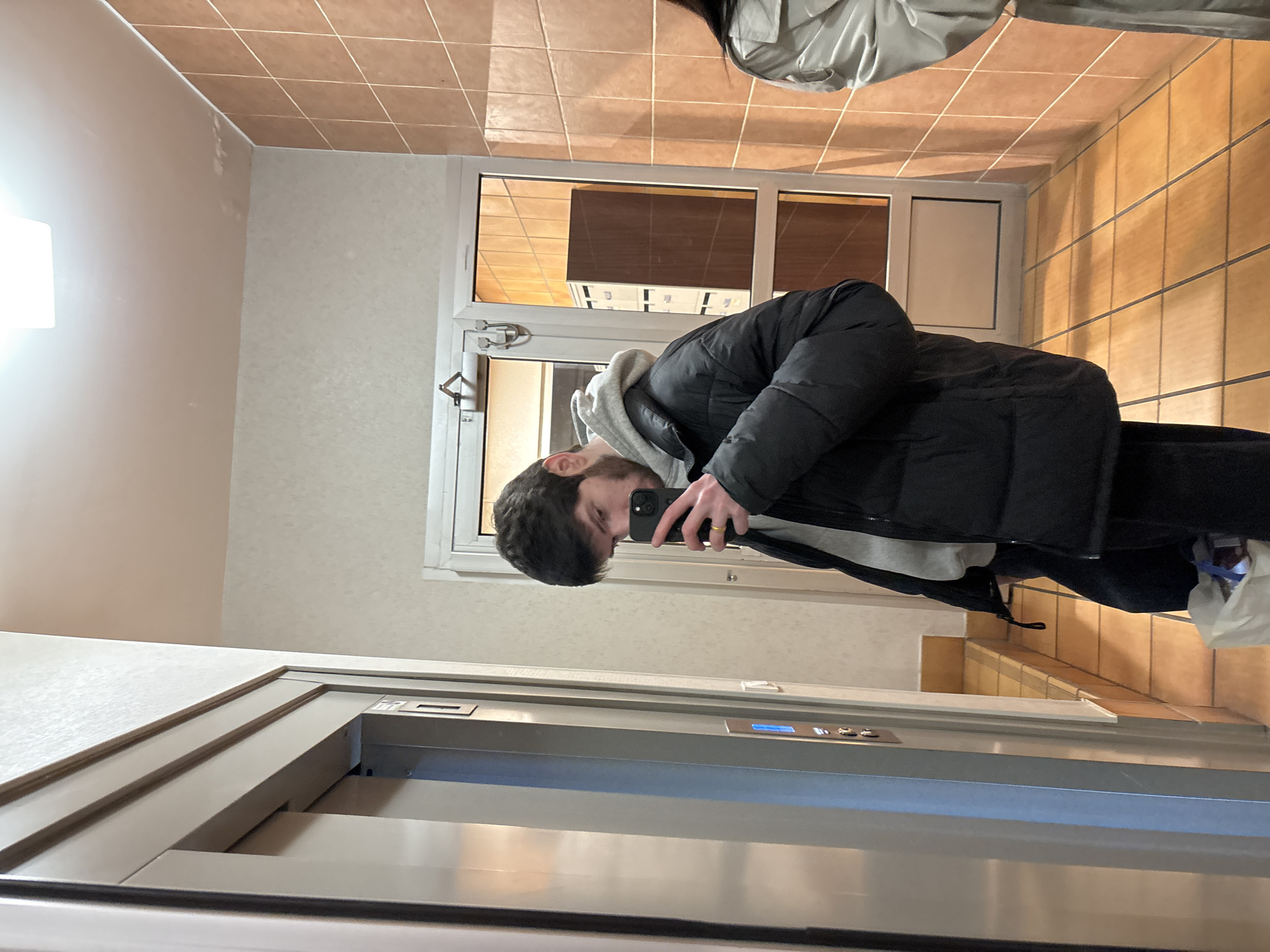 A person wearing a black jacket and grey hoodie is taking a selfie in what appears to be an elevator