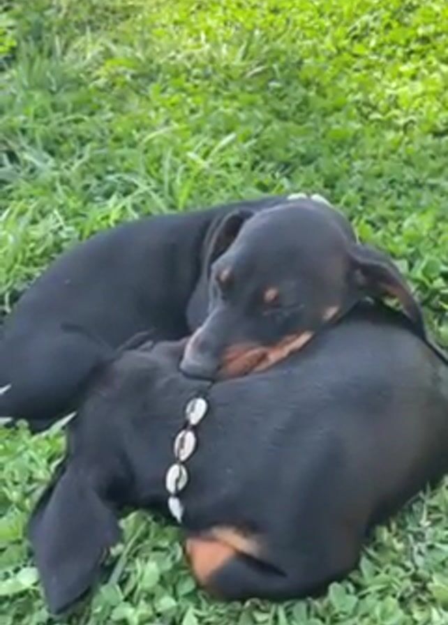 two black and brown dachshund puppies nestled together on a patch of green grass and clover