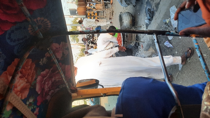 The photo is taken from inside a vehicle, possibly a tuk-tuk, with a floral patterned roof visible. Outside, several people are gathered around a large pot or vat that appears to be cooking food. One person is using a large utensil to stir the contents. Some men are dressed in traditional white clothing. A mobile phone is being held to take photos. The scene is likely taking place in an outdoor market or food preparation area.