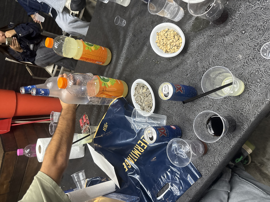 The image depicts an indoor casual gathering around a dark, patterned table laden with beverages and snacks