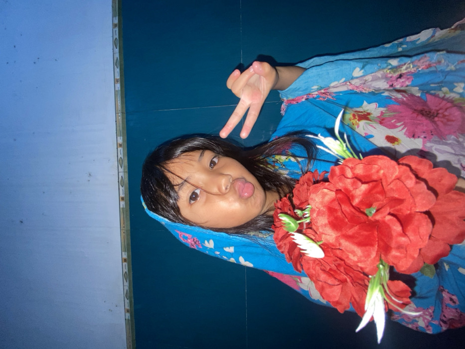 A young girl with long, dark hair wears a blue, floral-patterned shawl or head covering. She puckers her lips and holds up a hand making a "peace" sign. A large bouquet of red flowers with white accents is positioned near her face. The background is a two-toned wall divided vertically with white on the left and teal blue on the right.