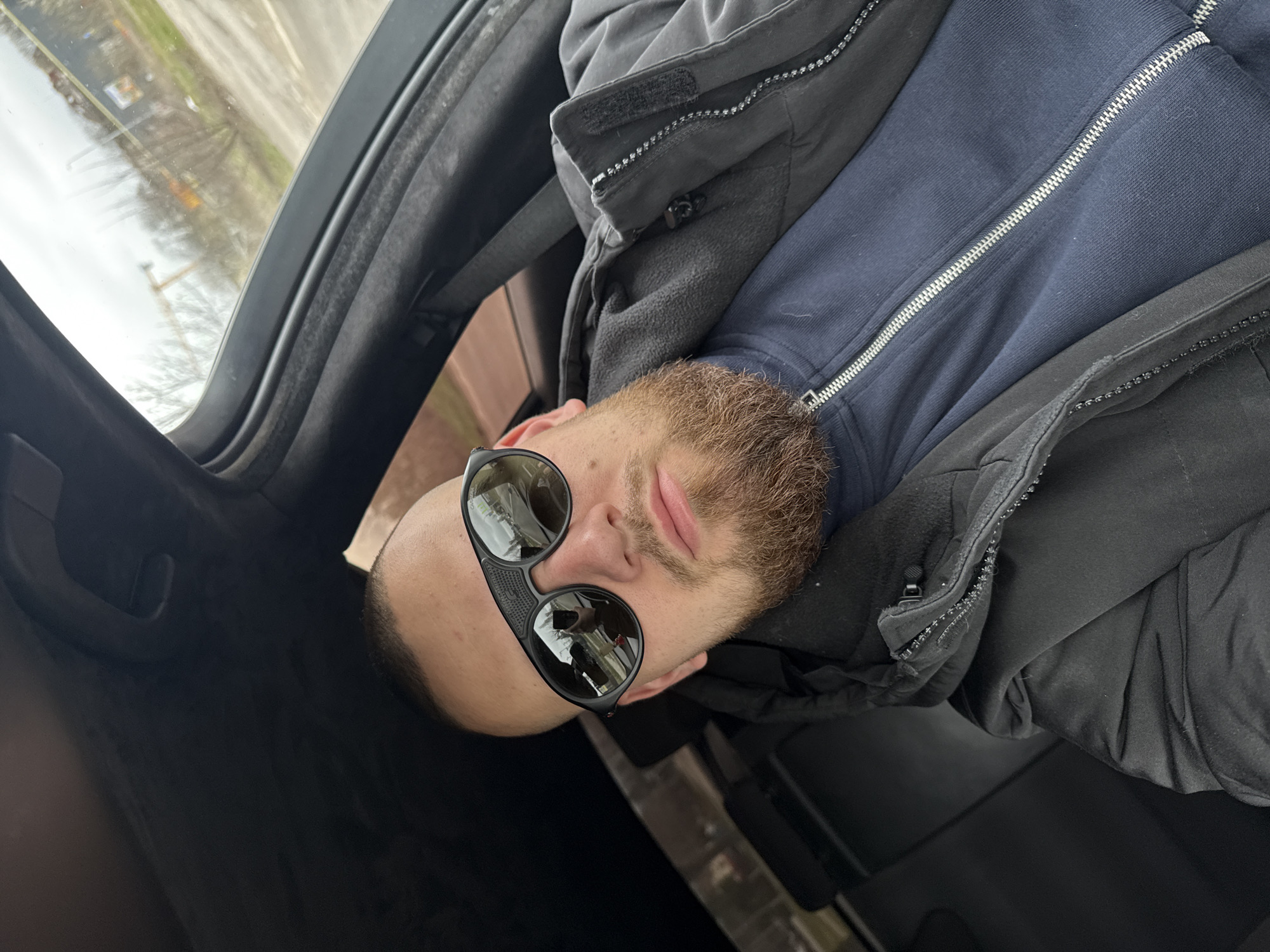 A man with a beard and sunglasses is lying inside a car