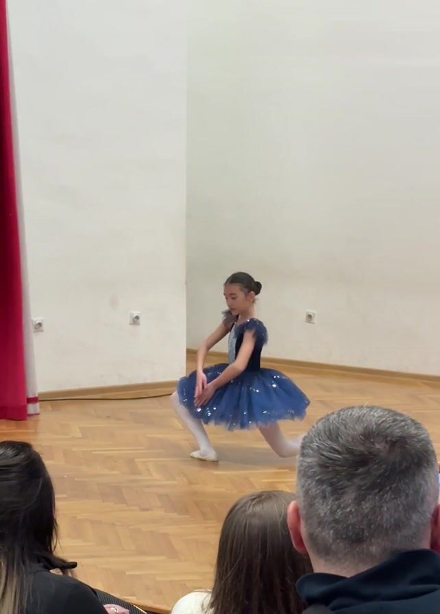 A young girl performs a ballet routine in front of an audience