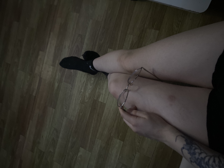 An individual is depicted from the waist down, seated or reclined in an interior location within Saratov, Russia. The legs are bare, with black shorts visible at the top of the thighs. The feet are clad in black ankle socks featuring a white Nike swoosh logo on the outer side of each foot, and are crossed at the ankles. A left hand with visible tattoos on the forearm holds a pair of eyeglasses with thin, light-colored frames, resting them on the left thigh. A purplish discoloration, consistent with a bruise, is visible on the upper left thigh. The flooring consists of light brown, wood-patterned laminate or plank material. The lighting in the scene is dim.