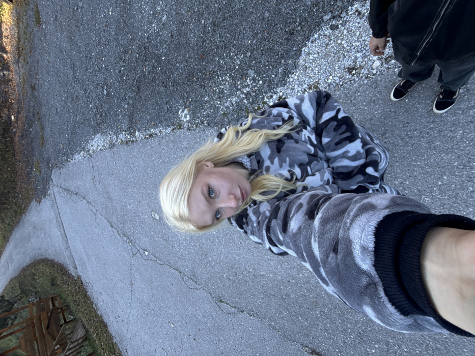 An outdoor scene captured from a high angle shows two individuals on a paved road. The location is in the city of Bistrica, Montenegro. A female individual, appearing to be the photographer, occupies the central and left portion of the frame. She has long, straight blonde hair, light skin, and blue eyes, and is looking directly at the camera with a neutral expression. She is wearing a grey, black, and white camouflage-patterned fuzzy hooded sweatshirt. Her right arm, extended forward, is visible in the immediate foreground, indicating a selfie perspective. A second individual is partially visible in the bottom right corner, with only their lower legs and feet observable. They are wearing dark pants, possibly with a zipper detail on the side, and black sneakers with white soles. A hand is also partially visible on the right side, belonging to this individual. The ground consists of a grey asphalt or paved road, exhibiting cracks and wear, particularly a prominent crack running down the center. This road curves left into the background. To the right of the paved road is a distinct shoulder composed of darker gravel or crushed stone, separated by a thin, irregular line of lighter aggregate. Sparse dry vegetation and fallen leaves are visible along the left edge of the road, adjacent to an uphill slope. A wooden structure, possibly a fence or part of a building, is discernible on this slope further in the background. The lighting is diffused, suggesting an overcast day.