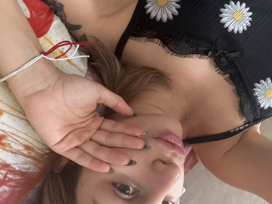 An overhead, angled image depicts a female individual lying down. Her right hand, adorned with dark-colored nail polish, partially covers the left side of her face, obscuring the bridge of her nose and a portion of her mouth. Her left eye is visible and open. A thin bracelet composed of white and red strings is tied around her right wrist. She has light brown hair. The individual is wearing a black camisole or tank top with thin straps, featuring black lace trim along the neckline and multiple white daisy patterns with yellow centers. A small black bow is present on the lace trim near her right shoulder. A thin, delicate necklace with a small metallic pendant is visible around her neck, and a dark, indistinct tattoo is partially visible on her upper right shoulder. The background behind her head features a multi-colored, abstractly patterned pillow or fabric in shades of red, orange, and white. The lower left portion of the image shows a plain, light-colored surface, likely bedding. The image does not contain any discernible visual information to corroborate the specified location of Plovdiv, Bulgaria.