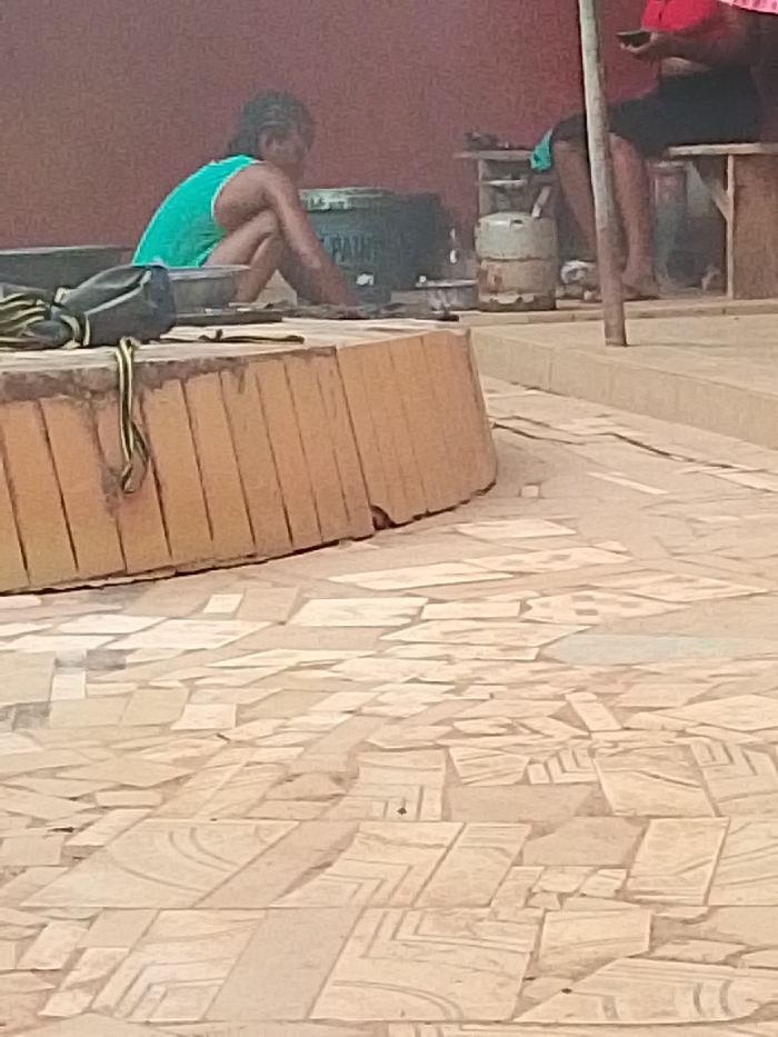 The image depicts an outdoor scene in Agbor, Nigeria, featuring two individuals and various objects against a reddish-brown wall background. In the mid-ground, a person with dark hair, wearing a teal sleeveless top, squats low to the ground. They are positioned behind a dark container labeled "PAINT" and appear to be manipulating small items on a surface in front of them. To their right, a second individual, wearing a red top and dark lower garments, sits barefoot on a wooden bench. This person is partially obscured by a vertical pole and appears to be holding a small, dark object. Behind the seated individual, a makeshift shelf with several items and two light-colored, barrel-shaped containers are visible. In the immediate foreground, a curved, light brown structure with vertical segmenting obstructs the lower portions of the scene. On top of this structure, to the left, a dark bag with a black and yellow/green striped strap rests, and a similar striped rope or strap hangs over its edge. The ground is paved with light-colored, irregularly shaped tiles, some exhibiting faint geometric patterns.