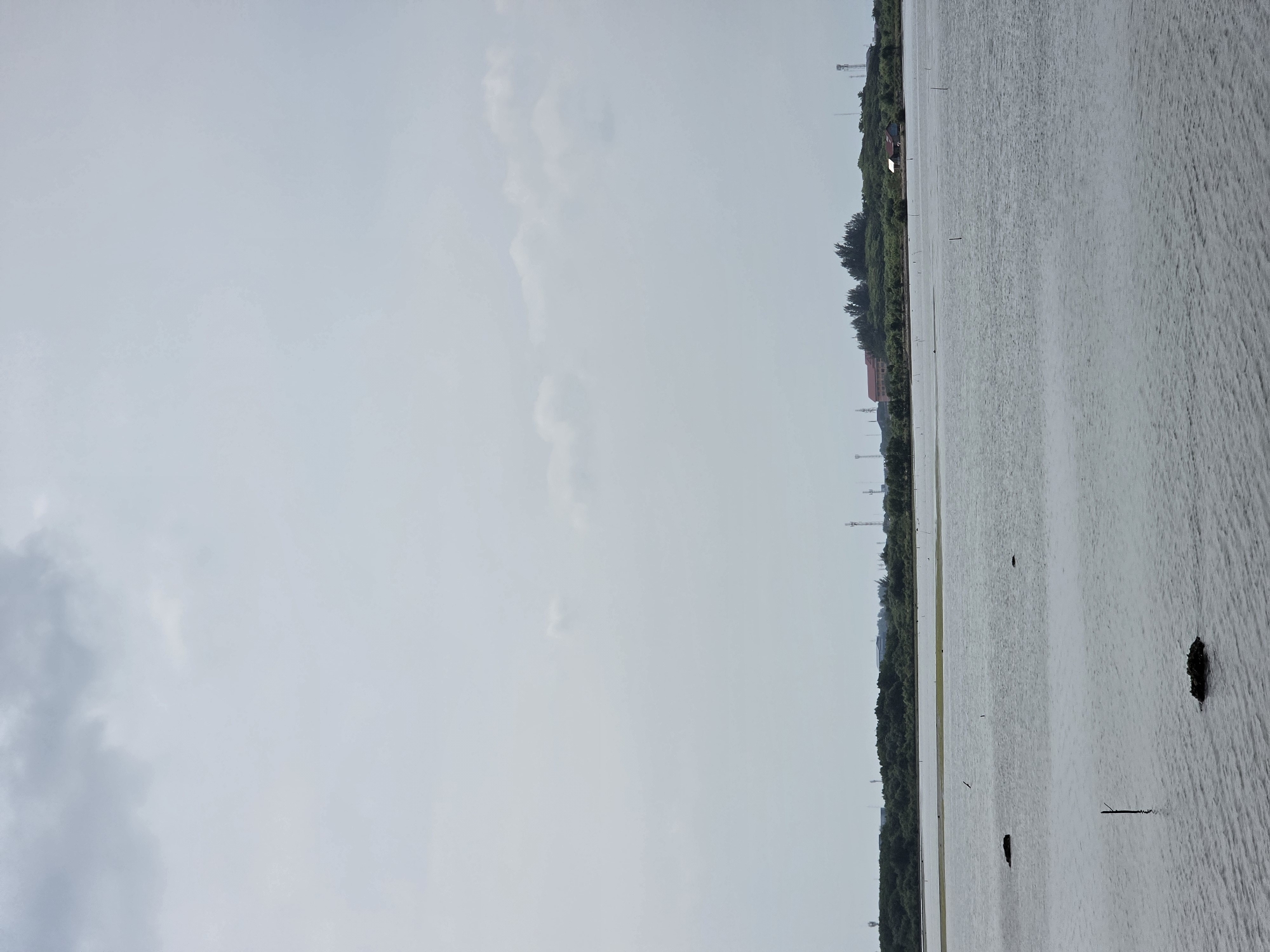 The image displays a wide view of a body of water under an overcast sky in Banda Aceh, Indonesia. The upper two-thirds of the frame are occupied by a light grey sky with diffuse cloud formations. The lower portion features a calm, grey-green water surface exhibiting minimal ripples. In the immediate foreground water, a dark, irregular object, potentially a rock or submerged vegetation, is visible in the lower-center. A single dark vertical pole protrudes from the water mid-left. Further into the mid-distance water, several additional thin vertical poles are sparsely distributed. The horizon is marked by a distant shoreline consisting of dense, dark green vegetation, likely mangroves or trees. Above this vegetation, several slender communication towers are visible. A light-colored building with a red roof is partially obscured by trees on the left side of the distant shore, while a smaller, light-colored building with a dark roof is discernible on the right. A small bird is faintly visible in flight over the mid-distance water, to the left of center. No human subjects or explicit interactions are present.