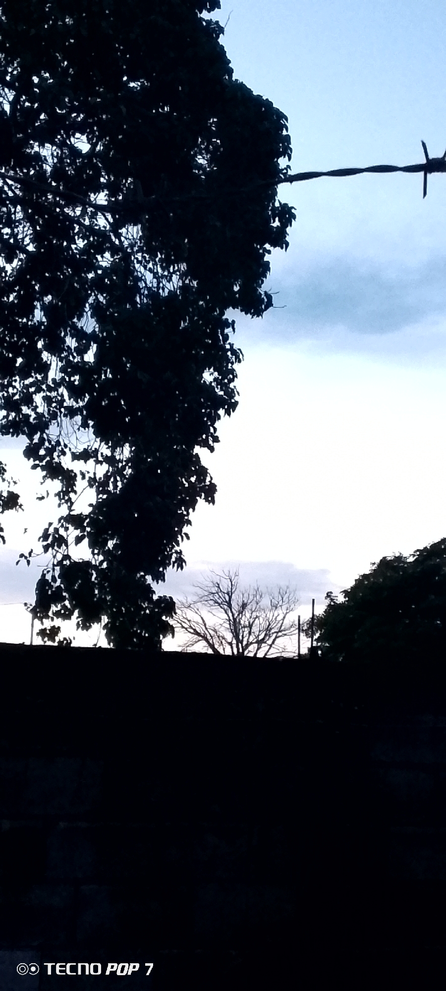 A low-angle, dusk or dawn scene shows trees silhouetted against a bright sky, likely in Altagracia, Venezuela. A wire, possibly barbed, stretches across the upper right corner. The foreground is dark, obscuring details of the immediate environment. A leafless tree is visible in the mid-ground, situated behind a dark structure that could be a wall or building. Foliage from another tree is present on the upper left and right.