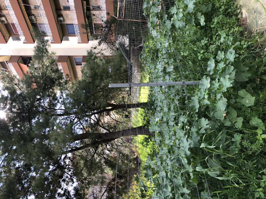 section of a metal fence separating a lush green garden from a tall, red-brick apartment building. The building is visible in the upper left corner of the image, and its facade is partially obscured by the branches of a large pine tree growing in front of it. The tree's branches extend over the fence, with the bright sun illuminating the leafy foliage from behind the camera. The garden contains various plant species, including broad-leaved plants and tall blades of grass, growing through and over the fence. The image was captured in Marousi, Greece, at the coordinates 38.055 latitude and 23.797 longitude.