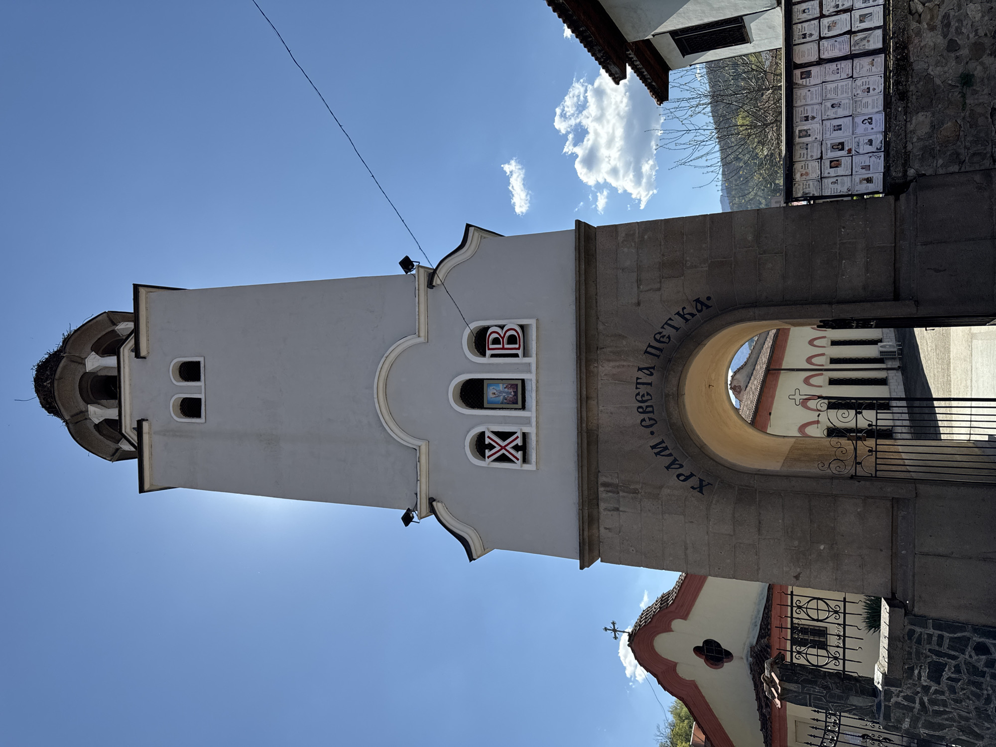 n upward angle view of the Church "St. Petka" in Peshtera, Bulgaria. The church is a white tower with arched windows, including religious symbols and a possible icon. At the top of the tower is a storks nest. An arched entrance adjoins the tower with Cyrillic text above the archway. Through the archway is a view of another part of the church and wrought-iron gates. The background includes a wall of plaques with photos of individuals, likely a memorial. The sky is clear and blue with a few scattered clouds. Power lines can be seen above the building.