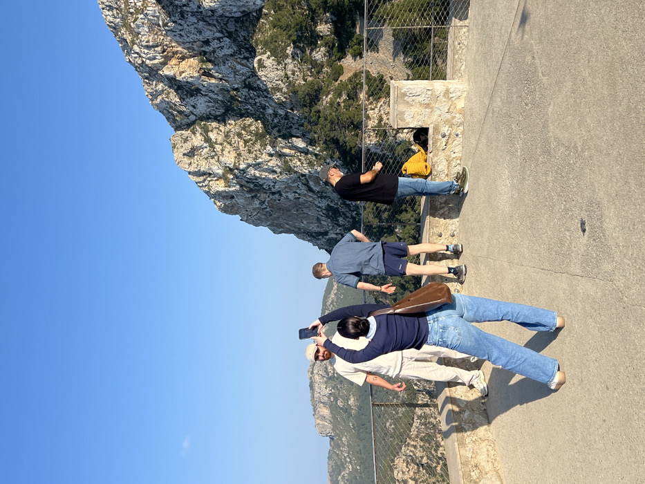 This image depicts an elevated outdoor viewpoint in Pollença, Spain, offering a clear view of rugged, rock-faced mountains under a cloudless blue sky. A paved concrete observation deck features a low stone barrier topped with a metal wire-mesh fence that overlooks a forested valley. Four individuals are present on the observation deck. In the foreground, a person with their back to the camera, wearing a dark blue long-sleeved top, light blue jeans, and light-colored shoes, holds a black smartphone vertically with both arms raised, appearing to capture an image or video. A brown shoulder bag hangs from their right side. Directly in front of this person, a male subject with a light beard and wearing a light-colored cap, t-shirt, and trousers stands facing the camera operator with raised arms, seemingly posing. A tattoo is visible on his right forearm. To the right, another male subject, wearing a blue short-sleeved collared shirt, dark shorts, and athletic shoes, stands with his back partially to the camera, looking towards the right side of the frame. Further to the right, a fourth male subject, wearing a grey baseball cap, black t-shirt, blue jeans, and athletic shoes, stands facing the stone barrier, looking down at a bright yellow bag and a dark object resting on the barrier. Shadows are cast by the individuals and the barrier onto the concrete surface.
